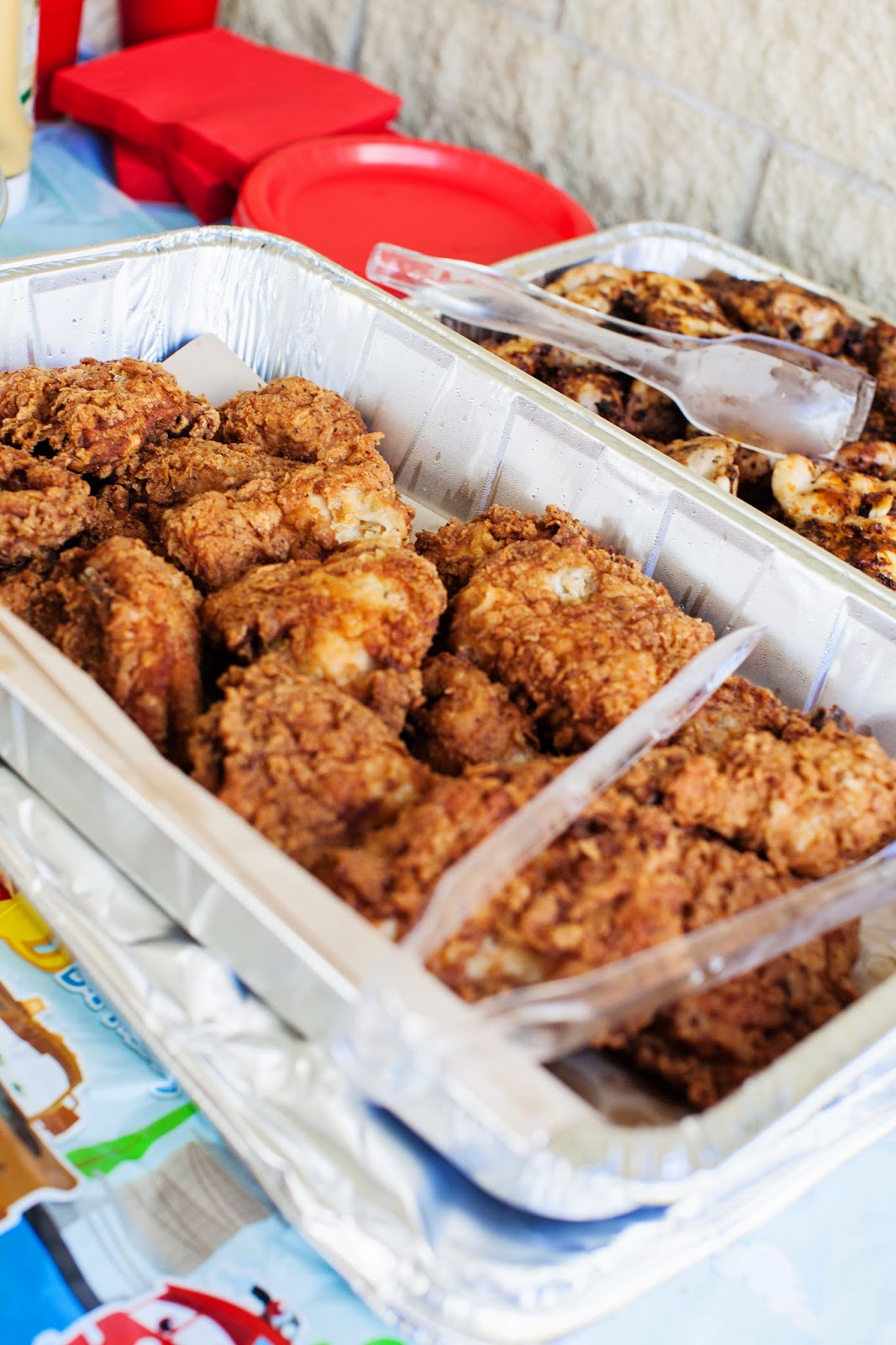 We had favors for each child to take - they could choose one item from a basket of a variety of products I found at Party City. We had a Cars cup filled with Cars themed Smarties & lollipops for kids. We had a canvas for people to sign and give well wishes to Elijah that we plan to later put up in his room. We had a centerpiece with Dum-Dums for kids to take, and a selection of peanut butter and jelly sandwiches for kids who might not want chicken.